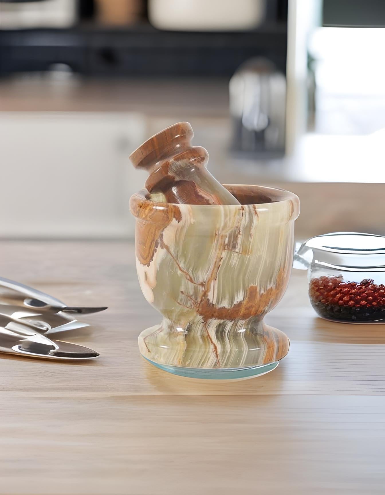 - Handcrafted from high-quality Green Onyx, our 2.5" Mortar and Pestle Set combines elegance with usability.